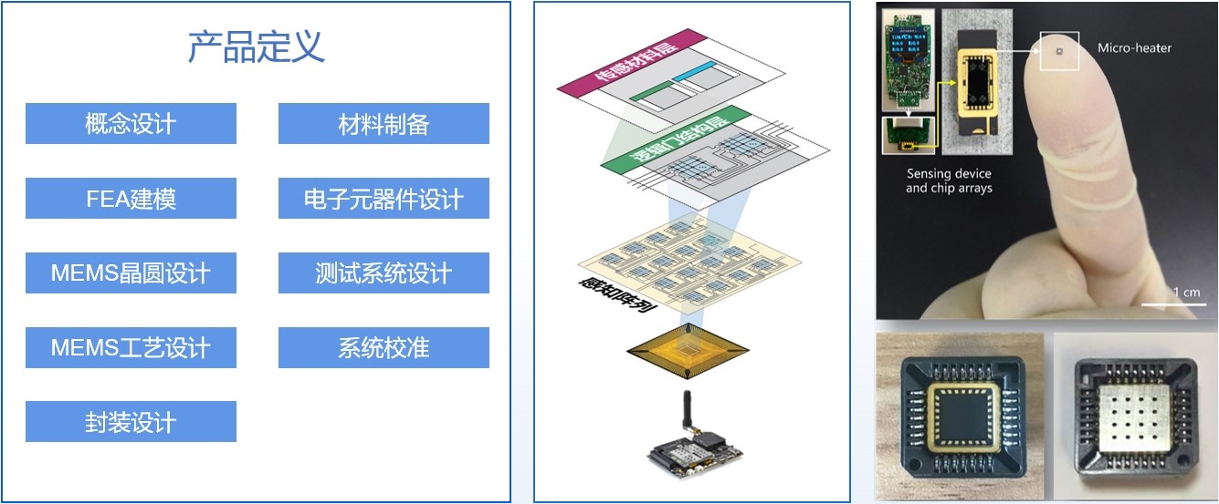 流片成功率:>40%;溫度測(cè)量精度:<1℃;加熱功耗:<50mW;升溫降溫迅速:≈200℃/秒;響應(yīng)速度:<7s;靈敏度:<10mg/m3,無交叉敏感性;防護(hù)等級(jí):IP65封裝;封裝尺寸:≤5×5cm。